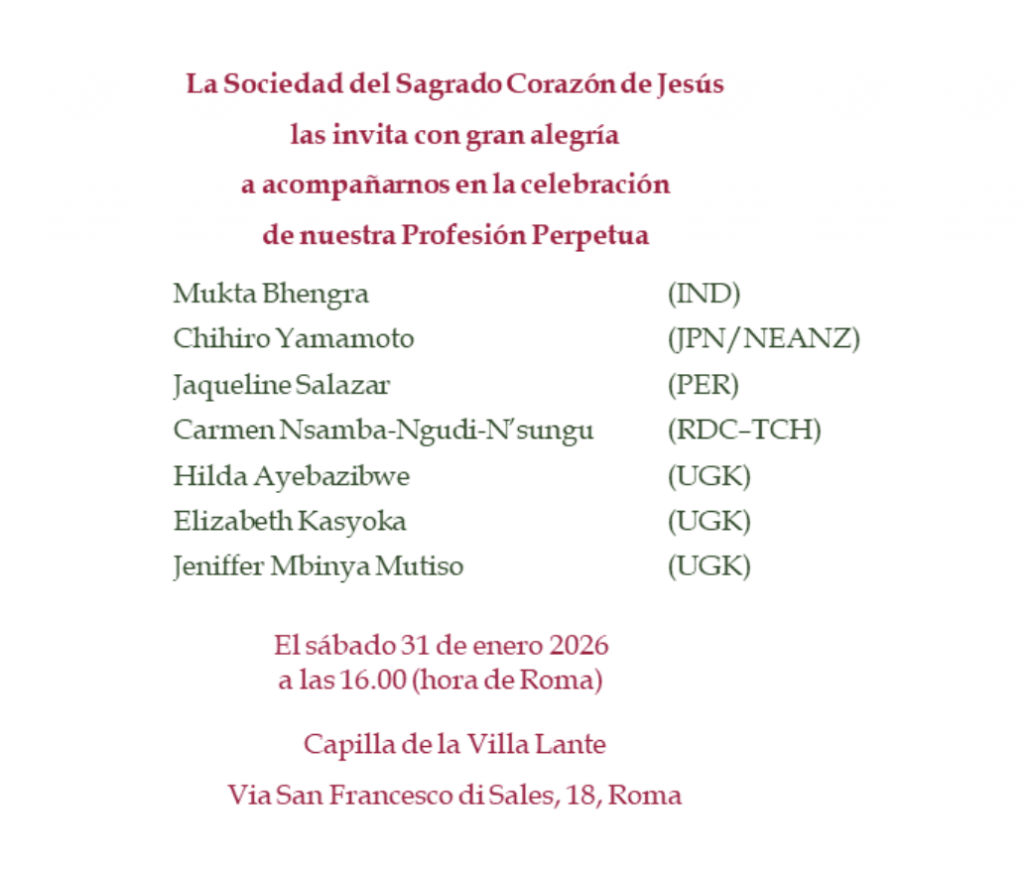 Con inmensa alegría, la Sociedad del Sagrado Corazón de Jesús invita a celebrar con las probanistas de la Sociedad la profesión perpetua el 31 de enero de 2026 a las 16h (hora de Roma) a través de una retransmisión por youtube.